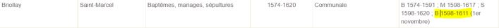 - Briollay – Mariages – 1598-1617 (Vues 75-77). Liste alpha (PDF).